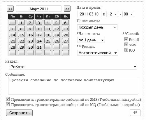 Затем в полях Напоминать укажите периодичность напоминания (например, система может оповещать вас о предстоящем событии каждые три дня, или ежедневно, или еженедельно, и т. д.), и путем установки соответствующих флажков выберите способ оповещения – электронное письмо, СМС-сообщение или сообщение по ICQ.