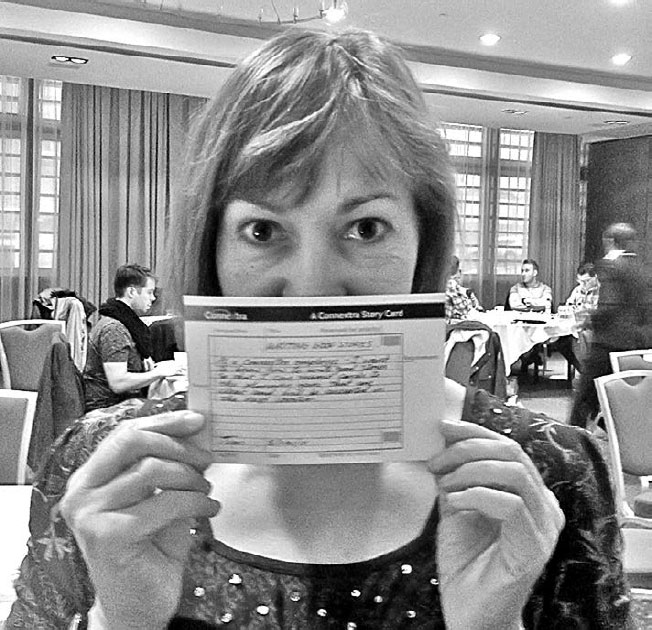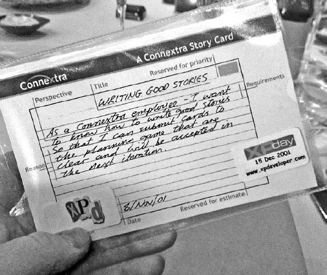 Ребята из Connextra использовали этот шаблон некоторое время, а потом захотели поделиться своим замечательным изобретением с другими. Они напечатали стопку карт-образцов, которые продемонстрировали на XPDay 2001, небольшой конференции в Лондоне. На фотографии Рэчел держит именно такую карточку. Это последняя карточка из того набора и, возможно, последняя из существующих, поэтому ее можно назвать историческим памятником.