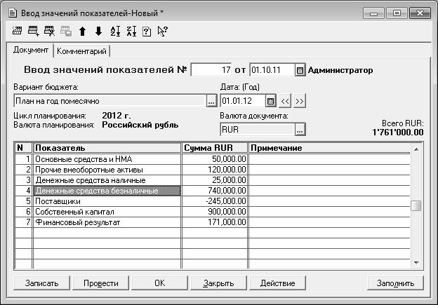 Перед тем как приступить собственно к бюджетированию, следует ввести необходимые начальные данные (то есть входящие остатки на начало цикла планирования), причем это касается как плановых, так и фактических данных. В рассматриваемой конфигурации эта задача решается с помощью документа Ввод значений показателей, для создания которого предназначена команда главного меню Документы?Ввод значений показателей. В результате ее выполнения открывается окно, изображенное на рис. 4.18.