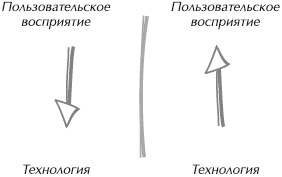 Единственный способ избежать подобной ситуации – приступить к проектированию и разработке сверху вниз, то есть с того, что пользователь увидит на экране, спускаясь сначала к высокоуровневым компонентам, а затем – к рабочим элементам. Как только появится предварительная концепция с набросками всего, с чем будет работать пользователь, инженеры и технологи должны взять на себя ответственность за то, чтобы их замыслы соответствовали этой концепции. Можно ли сделать то, что будет спроектировано? Какие для этого могут понадобиться компромиссные решения? Какие ограничения должны быть учтены? В ходе работы ведутся дискуссии, перемещаемые вниз и вверх по уровням проектирования, и специалисты разного профиля, входящие в команду, обеспечивают по мере хода этого процесса соблюдение целостности того, с чем придется работать пользователю, не вторгаясь в область того, что возможно получить (и должно быть получено) от разработчиков. Конструкторская мысль будет продвигаться в двух направлениях: от ожидаемого пользовательского восприятия вниз к технологии и от практической технологии вверх к пользовательскому восприятию (рис. 5.5).