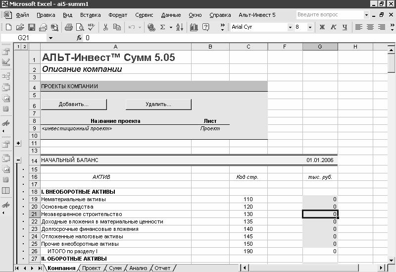 Система «Альт-Инвест Сумм» включает в себя несколько листов Excel.