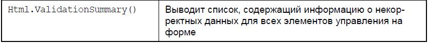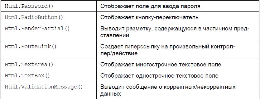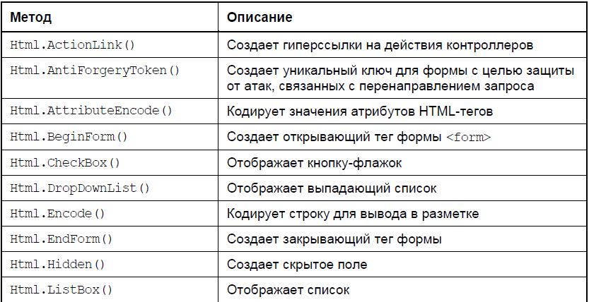 Вспомогательным методом может быть любой статический метод, доступный на уровне представления, однако для упрощения общей структуры проектов MVC их принято группировать в рамках класса HtmlHelper. В табл. 5.1 приведен список основных вспомогательных методов класса HtmlHelper.