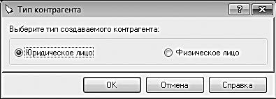 Чтобы зарегистрировать нового контрагента, перейдите в правую часть окна и нажмите в инструментальной панели главного интерфейса (см. рис. 6.1) кнопку Добавить (она является первой слева, ее название отображается в виде всплывающей подсказки при подведении указателя мыши) или выполните команду контекстного меню Добавить. В любом случае на экране откроется диалог для выбора типа контрагента (рис. 6.5).