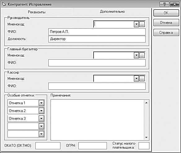 Рис. 6.7. Ввод и редактирование сведений о контрагенте, вкладка Дополнительно