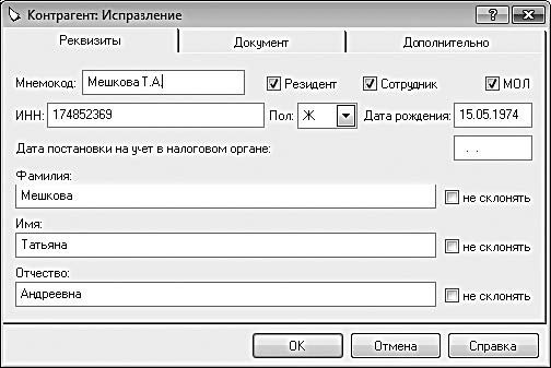 Чтобы ввести сведения о физическом лице (это может быть как контрагент, так и собственный сотрудник), нужно в окне, изображенном на рис. 6.5, установить переключатель в положение Физическое лицо и нажать кнопку ОК. Чтобы просмотреть и, при необходимости, отредактировать параметры зарегистрированного ранее физического лица, дважды щелкните на нем мышью или используйте команду контекстного меню Исправить. В любом случае на экране отобразится окно, которое показано на рис. 6.9.
