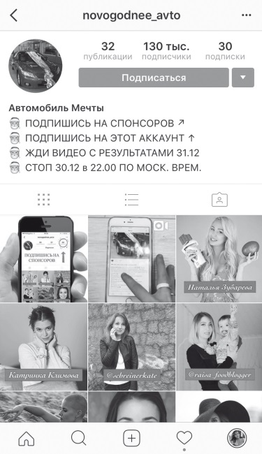 Суть проста – несколько (обычно 5–15) блогеров объединяются и разыгрывают один дорогой и качественный приз. Основное условие участия в конкурсе – подписка на всех организаторов. По сути, это завуалированный обмен аудиторией между блогерами. Этот метод также может вызывать негатив, но, в целом, на текущий момент это самый рабочий вариант. Один из моих клиентов участвовал в самом первом розыгрыше коляски, и в сухом остатке (после отписок) он получил прирост в 12 тысяч подписчиков.
