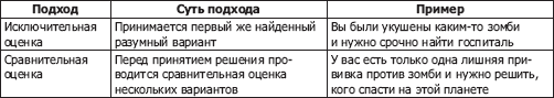 В уже упоминавшейся книге «Sources of Power: How People Make Decisions» автор определяет два основных способа принятия решений: проведение исключительной и сравнительной оценок (табл. 8.1). При проведении исключительной оценки рассматривается и оценивается по определенным критериям первый же найденный вариант (хочется ли мне сегодня надеть эту зеленую рубашку?). Если он отвечает заданным критериям, то принимается в качестве решения, и человек, отвечающий за принятие решений, переходит к более важным проблемам. Если первый найденный вариант этим критериям не отвечает, рассматривается следующая идея или вариант, и процесс повторяется (а что, если все-таки надеть желтую рубашку?). Примером может послужить поиск туалета после выпитой литровой бутылки газировки или попытка найти местечко, где можно было бы перекусить после трехдневной голодовки. В этом случае вполне достаточно найти первый же попавшийся туалет или ресторан и в поиске еще одного подобного объекта смысла уже не будет.