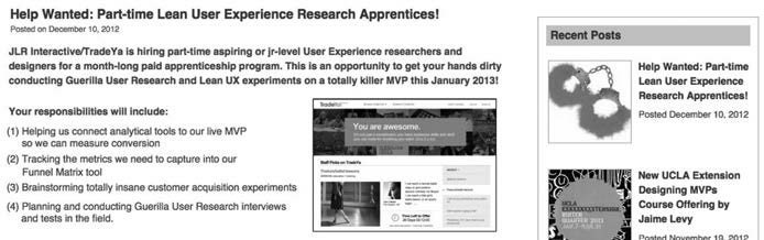 Так родилась программа стажировки для TradeYa. Мы с Джаредом хотели распределить бюджет по максимально возможному количеству «свежих голов», которые совместно бы работали над объединением всех аналитических инструментов, необходимых для обновления существующего продукта MVP. Они должны были использовать матрицу воронки для интеграции данных обратной связи из других инициатив, чтобы мы могли проверить все предположения базовой команды о степени вовлечения пользователей. На рис. 9.2 показано сообщение в блоге, которое мы использовали для привлечения необходимых талантов.