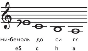 Попробуем прочитать эту музыкальную подпись. Три ноты из нее и знак бемоля вам уже знакомы из подписи Шумана:?бемоль-А-С-H. Как сказано выше, бемоль сократился до s. Получаем?s-А-С-H.