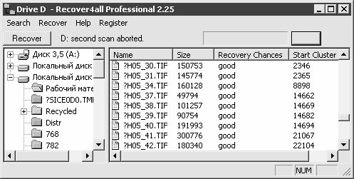 Следует учитывать, что после запуска программы в левой части окна показан только перечень используемых дисков. Чтобы увидеть содержимое диска, необходимо щелкнуть мышью на символе +, который расположен слева от названия диска. При этом автоматически будет запущен процесс сканирования, который может занять продолжительное время. При необходимости сканирование можно прервать досрочно. В правой части окна отобразится информация только после полного либо частичного сканирования выбранного диска.
