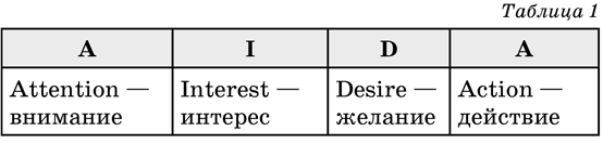 AIDA – классическая схема продаж. Расшифровывается данная аббревиатура следующим образом (см. табл.1).
