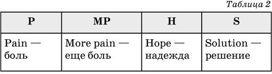 PMPHS – вторая схема продаж, которая носит название «формула ухода от боли», или «модель наименьшего зла». Расшифровывается такая аббревиатура просто (см. табл. 2):