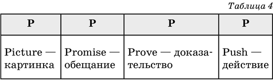 4Р-копирайтинга – четвертая система продаж. Стандартно аббревиатура расшифровывается таким образом (см. табл. 4).