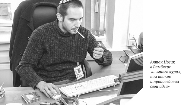К тому моменту Виктор выделил уже отдельный кабинет Антону Носику в Рамблере, и тот все чаще стал приезжать в компанию, много курил, пил коньяк и проповедовал свои идеи. Он все больше и больше стал раздражать весь коллектив, особенно основателей Рамблера.
