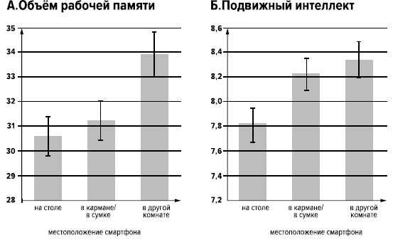 • Левый столбец этой диаграммы — показатели подвижного интеллекта лиц, которые, выполняя задание, видят перед собой телефон, перевёрнутый экраном вниз.