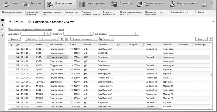 В разделе Покупки и продажи выполните команду Еще ? Поступление товаров и услуг. На экране откроется окно списка, изображенное на рис. 5.24.