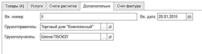 Поля Вх. номер и Вх. дата предназначены для ввода входящего номера и даты документа. Это реквизиты, которые были присвоены документу в процессе его выписки поставщиком (ведь нумерация документов у разных предприятий различается, а дата выписки документа может отличаться от даты поступления товарноматериальных ценностей получателю). В полях Грузоотправитель и Грузополучатель можно ввести соответственно грузоотправителя и грузополучателя по данному документу (грузоотправитель и грузополучатель – это далеко не всегда поставщик и получатель ценностей по документу).
