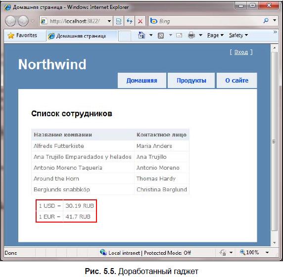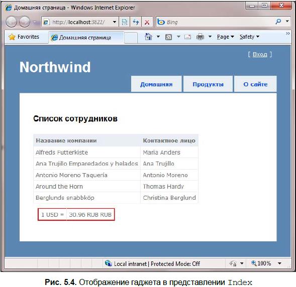 Использовать гаджет ExchangeRates можно в любом представлении. Например, при использовании в представлении Index, код которого показан в листинге 5.19, получается результат, приведенный на рис. 5.4.