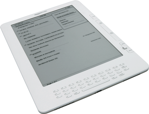 К числу наиболее современных и интересных решений относится «читалка», предложенная онлайновым магазином Amazon, – Amazon Kindle DX. Она оснащена большим экраном – 9,7 дюйма по диагонали, при этом его масса (с вмонтированным аккумулятором на десятки часов автономной работы) 536 г, а толщина меньше сантиметра. Разрешение экрана – 1200?824 точек (точнее, ячеек E-Ink, способных отображать по 16 градаций серого); имеется функция автоматического изображения в зависимости от того, как читатель держит экран – горизонтально или вертикально. Внутренняя память объемом 4 Гбайт (часть ее отведена под системные нужды) позволяет хранить тысячи электронных книг в форматах собственно Kindle (AZW), PDF, TXT, MOBI, PRC, а также – для любителей еще и послушать – Audible, MP3. Функциональность Read-to-Me позволяет самому Kindle DX озвучивать текстовые файлы для своего владельца – через встроенные динамки или подключенные к обычному 3,5-мм гнезду наушники.