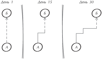На рис. 14.6 показан простой пример внесения изменений, связанных с корректировкой маршрута в направлении смещающейся цели. Проект стартовал в точке А и закончится, предположительно, в точке Б. Если через две недели после начала проекта (возможно, к завершению короткого этапа) руководители команды решат, что цели для Б изменились, направление проекта тоже должно сместиться, чтобы выровняться по точке Б. Еще через две недели будут внесены новые поправки и произойдет новая коррекция курса. Какая-то часть работ пропадет, но чем раньше будет изменено направление движения, тем меньше окажутся потери. Если перемещения совпадут с концом одного и началом другого этапа, у команды будет время, чтобы заняться проектированием, компенсирующим возникшие изменения, добавить работы, необходимые для модификации сделанного, и внести поправки в продолжительность этапов.