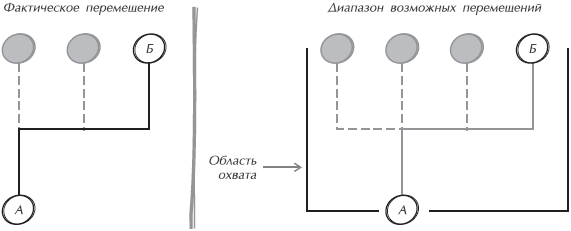 У диаграммы, изображенной на рис. 14.7, есть одна странная, хотя и незначительная особенность. Хронологическая последовательность представлена на ней вертикально, подразумевая, что область охвата со временем может предоставить больше возможностей для передвижений, что в корне неверно. Более точным будет представление, что область охвата изменяется, расширяясь и сужаясь в зависимости от того, в какой стадии проект находится. Обычно эта область сужается по мере близости работы к завершению. Но каждое перемещение вносит коррективы в действующий план, а вместе с ним и в возможности охвата будущих перемещений.