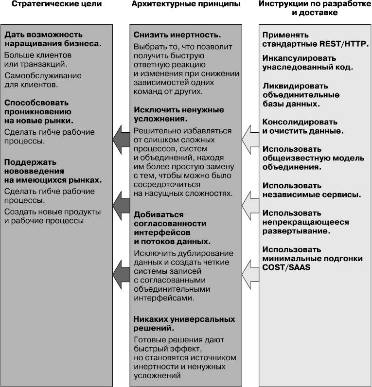 Чьи-то принципы становятся чьими-то инструкциями. К примеру, использование HTTP/REST можно назвать принципом, а не инструкцией, и в этом не будет ничего плохого. Дело в том, что ценность представляет наличие всеобъемлющих идей, дающих представление о ходе развития системы, и наличие достаточной детализации, позволяющей описать способы осуществления этих идей. Возможно, в объединении принципов и инструкций не будет ничего плохого, если речь идет о небольшой группе команд или даже об одной команде. Но для более крупных организаций, в которых могут применяться различные технологии и рабочие инструкции, для разных мест могут понадобиться разные инструкции, и при этом все они будут соответствовать общему набору принципов. Например, у. NET-команды может быть один набор инструкций, а у Java-команды — другой наряду с наличием набора инструкций, общего для обеих команд. А вот принципы у них должны быть общими.