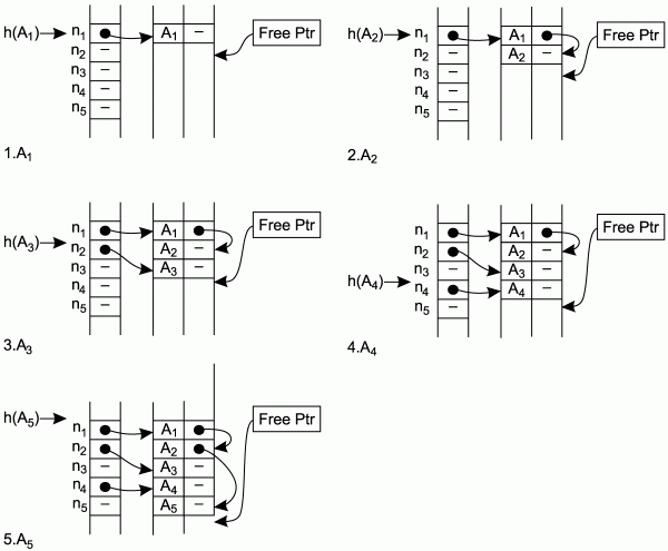 На рис. 1.2 проиллюстрировано заполнение хэш-таблицы и таблицы идентификаторов для ряда идентификаторов: A1, A2, A3, A4, A5 при условии, что h(A1) = h(A2) = h(A5) = n1; h(A3) = n2; h(A4) = n4. После размещения в таблице для поиска идентификатора A1 потребуется одно сравнение, для A2 – два сравнения, для A3 – одно сравнение, для A4 – одно сравнение и для A5 – три сравнения (попробуйте сравнить эти данные с результатами, полученными с использованием простого рехэширования для тех же идентификаторов).