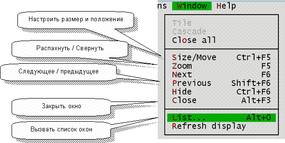 Изменить размер и положение окна можно командами Size/Move и мышью. Для перетаскивания окна «схватите» его мышью за верхнюю границу рамки, а для изменения размера – за правый нижний угол.