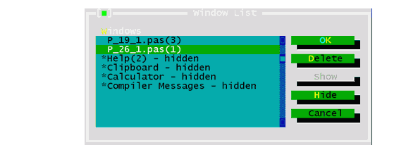 Касательно активного окна надо сделать важное замечание, связанное с компиляцией. Когда открыто несколько окон, нажатие клавиши F9 вызовет, вероятней всего, компиляцию файла, открытого в активном окне. Поэтому не забывайте перед компиляцией своей программы переключаться в нужное окно!