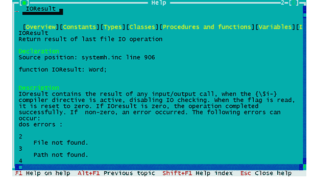 Первый удобен, когда интересующее вас слово уже содержится в тексте. Установите курсор в пределах этого слова (под любой его буквой), например, под словом IOResult, и нажмите комбинацию Ctrl+F1. Если справочная система найдет «досье» на это слово, то покажет его в окне «Help» (рис. 64).