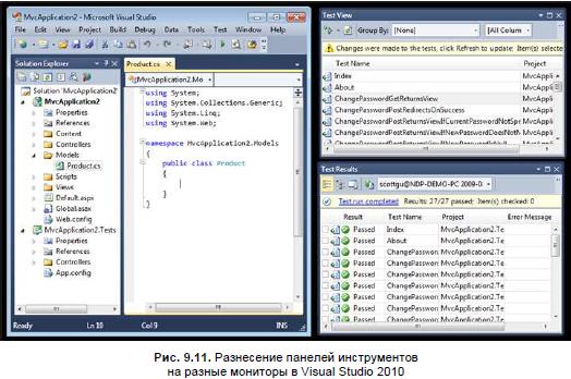 В связи с тем, что все окна в Visual Studio 2008 были частью одного главного окна, пользователи не имели возможности вынести часть окон на другие мониторы. В Visual Studio 2010 это проблема решена, теперь разработчик может расположить любые панели инструментов, информационные окна, окна редакторов кода и другие на разных мониторах (рис. 9.11).