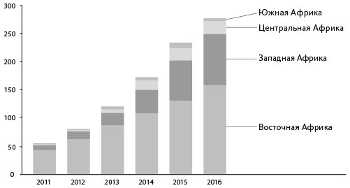 Итак, очевидно, что Африка – это не однородная территория, все граждане которой пользуются мобильными деньгами, а регион, где мобильные платежи бурно развиваются. По состоянию на конец 2016 года (информация из отчета ассоциации GSM «Мобильная экономика в странах Тропической Африки в 2017 году») в странах южнее Сахары насчитывалось 420 млн уникальных абонентов мобильной связи. Таким образом, степень проникновения на рынок в Африке составляет 43 %, и этот показатель растет здесь на 50 % быстрее, чем в среднем по миру. Значит, к 2020 году в регионе будет более полумиллиарда уникальных абонентов мобильной связи; к тому моменту около половины населения континента будет пользоваться мобильными услугами. Такие цифры стимулируют развитие целого спектра новых конкурентоспособных компаний.