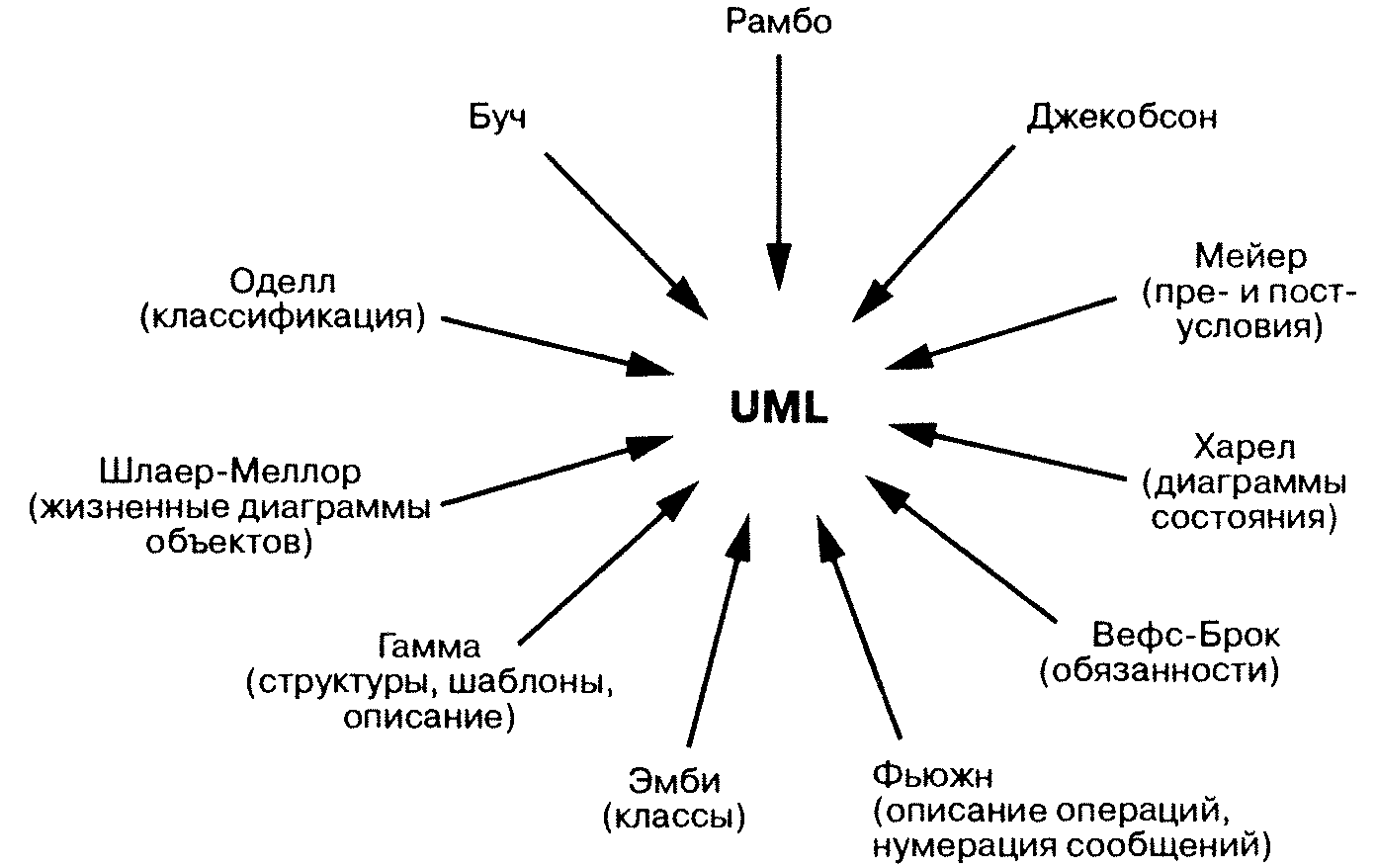 Конец войне методов положила нотация, принятая в языке UML. «Язык UML служит для определения, отображения и описания элементов объектно-ориентированных систем в процессе их создания. Он объединяет объектную модель, нотации Буча и ОМТ, а также лучшие идеи, предложенные авторами других методик (рис. 1.2). Таким образом, язык UML является стандартом де-факто в области объектно-ориентированного анализа и проектирования»[2].