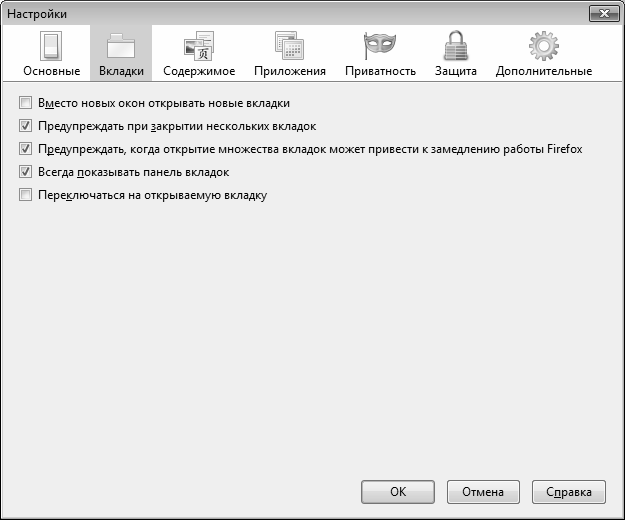 Рис. 7.31. Настройка Mozilla Firefox, раздел Вкладки