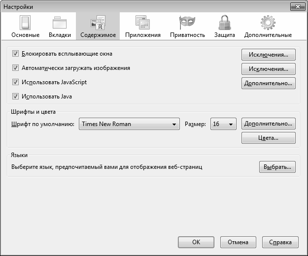 Рис. 7.32. Настройка Mozilla Firefox, раздел Содержимое