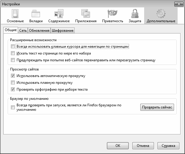 Рис. 7.33. Настройка Mozilla Firefox, раздел Дополнительные