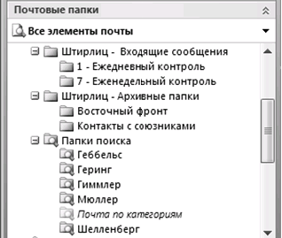 Вот, например, структура папок Штирлица: «Входящие», две контрольные папки («Ежедневный контроль» и «Еженедельный контроль»), архивные папки («Восточный фронт» и «Контакты с союзниками»), а также папки поиска:
