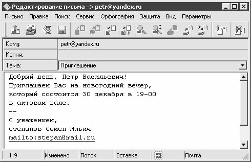 Для немедленной отправки почтового сообщения предназначена команда главного меню Письмо?Отправить немедленно, вызываемая также нажатием комбинации клавиш Ctrl+Enter; также для этого можно воспользоваться соответствующей кнопкой инструментальной панели. Не стоит забывать, что для этого необходимо наличие действующего подключения к Интернету.