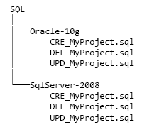 Джинны SQL Server и Oracle создадут нам в указанном каталоге подкаталоги, соответствующие целевой СУБД и её версии. В каждом подкаталоге находятся три SQL-скрипта, предназначенные, соответственно, для создания, обновления или удаления схемы БД.